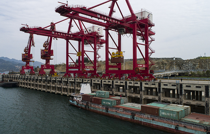 3月17日,在湖北省秭歸縣秭歸港,起重機(jī)往貨輪上吊裝貨物(無人機(jī)照片)。